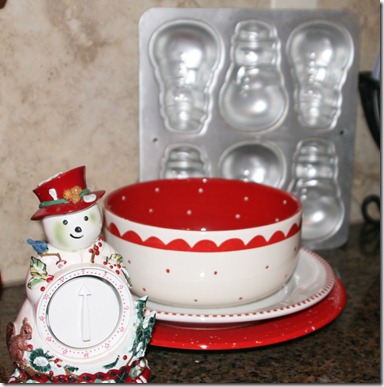 Tin polka dot cups and the snowman jar were a thrift store find.