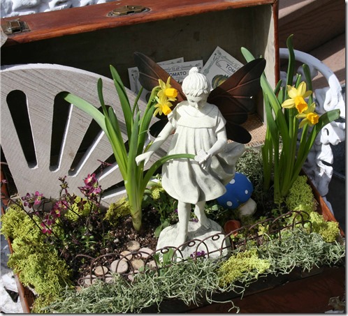 I haven’t found my fairies and gnomes from last year so I stuck in this large fairy that I just bought. Talk about Jack and the giant slayer.