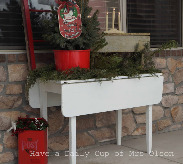 I wanted a fairly simple look so I brought the red window that had been on my mantle out and placed it on the drop leaf table. I removed the lights from the tree and tucked in the metal 'we could build a snowman' sign.