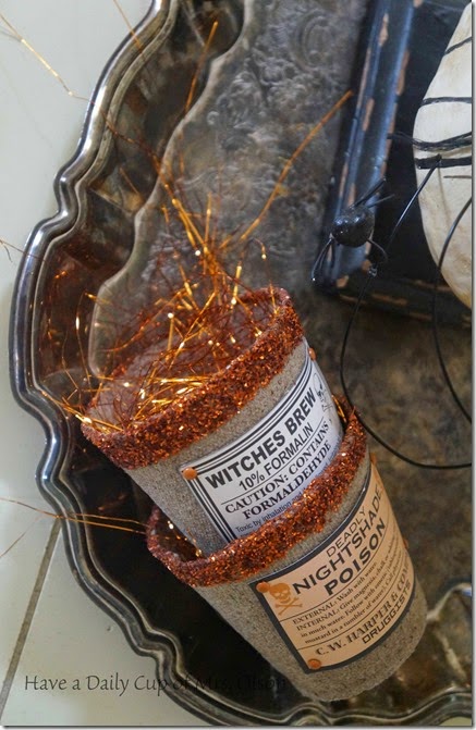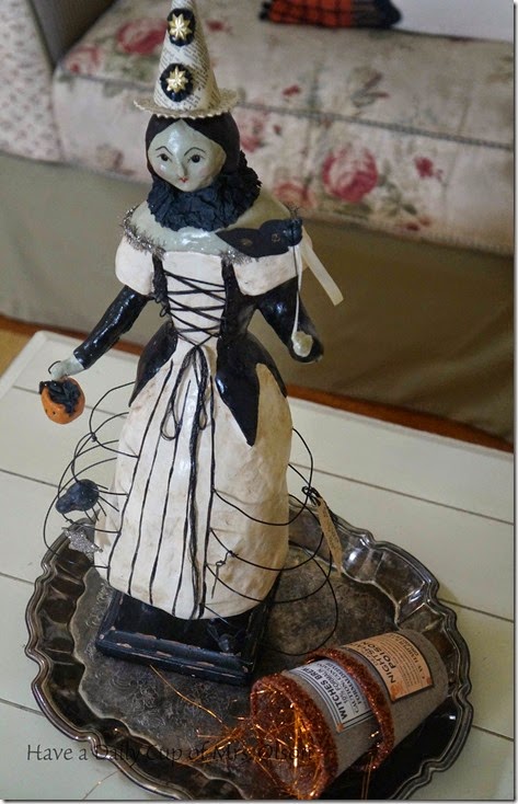 I love my Bethany Lowes primitive witch!  She sits on a tarnished tray alongside a couple of peat pots on my coffee table. I adorned the pots with glitter and  witchy labels a couple years ago to hold treats for a party.