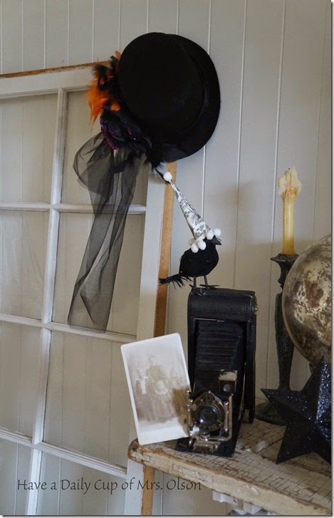 Love this fabulously spooky Halloween display! The banner, the typewriter, camera all together -- genius!! The hats on your ravens/black birds are inspiring me to make hats for my own little flock of Halloween ravens! Catherine