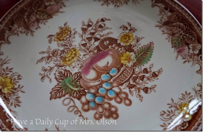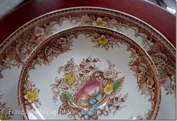 Lovely! You found some great items for your Thanksgiving table. I love the brown transfer ware with fruit. And love those gravy boats.