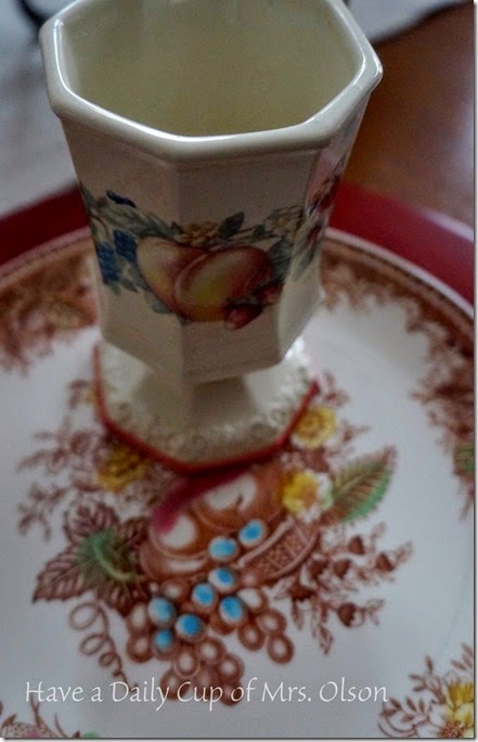 I decided to add them to my Thanksgiving tablescape. That’s when I remembered that I had these beauties. Fruit motif cups by Avon, called “Sweet Country Harvest”. They were a thrift find last year.