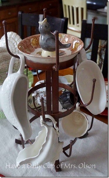 Jann, I like those cups with the dishes. Your bird looks so sweet sitting on top . Blessings for a great weekend, xoxo,Susie